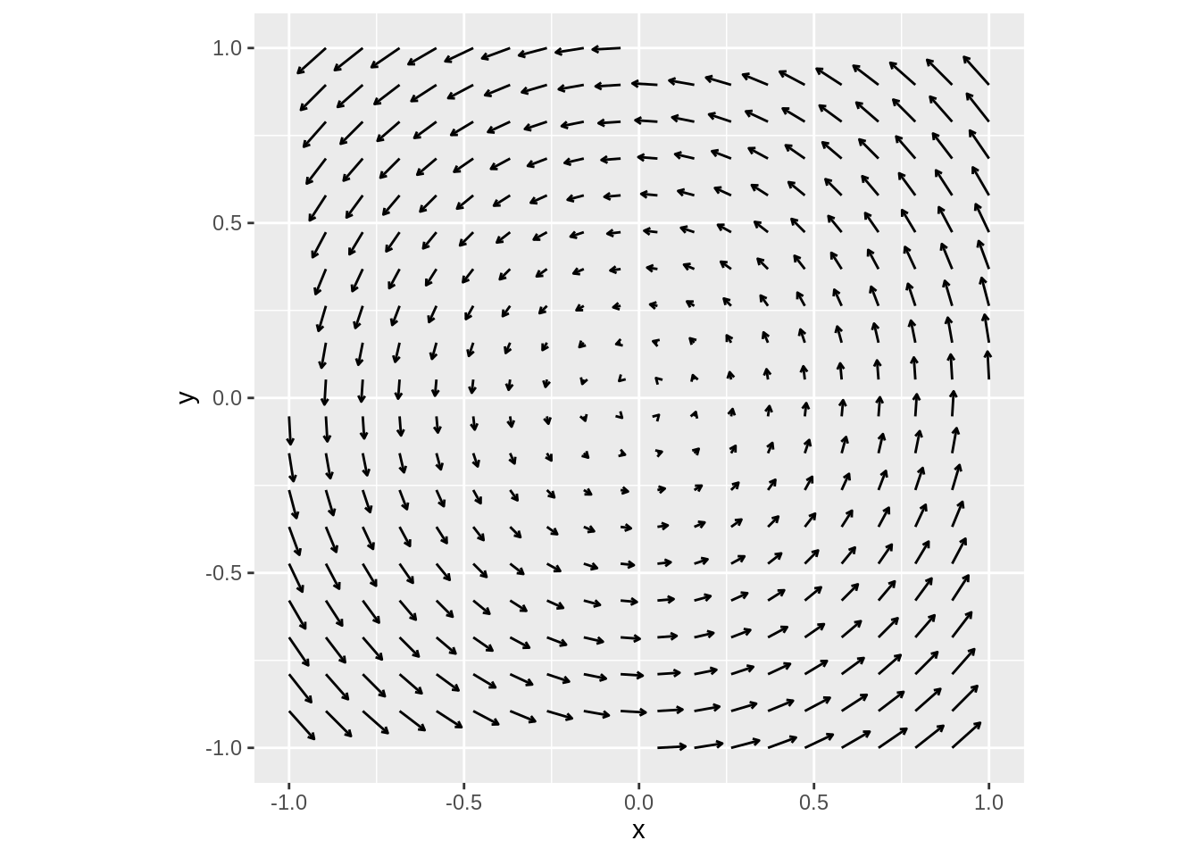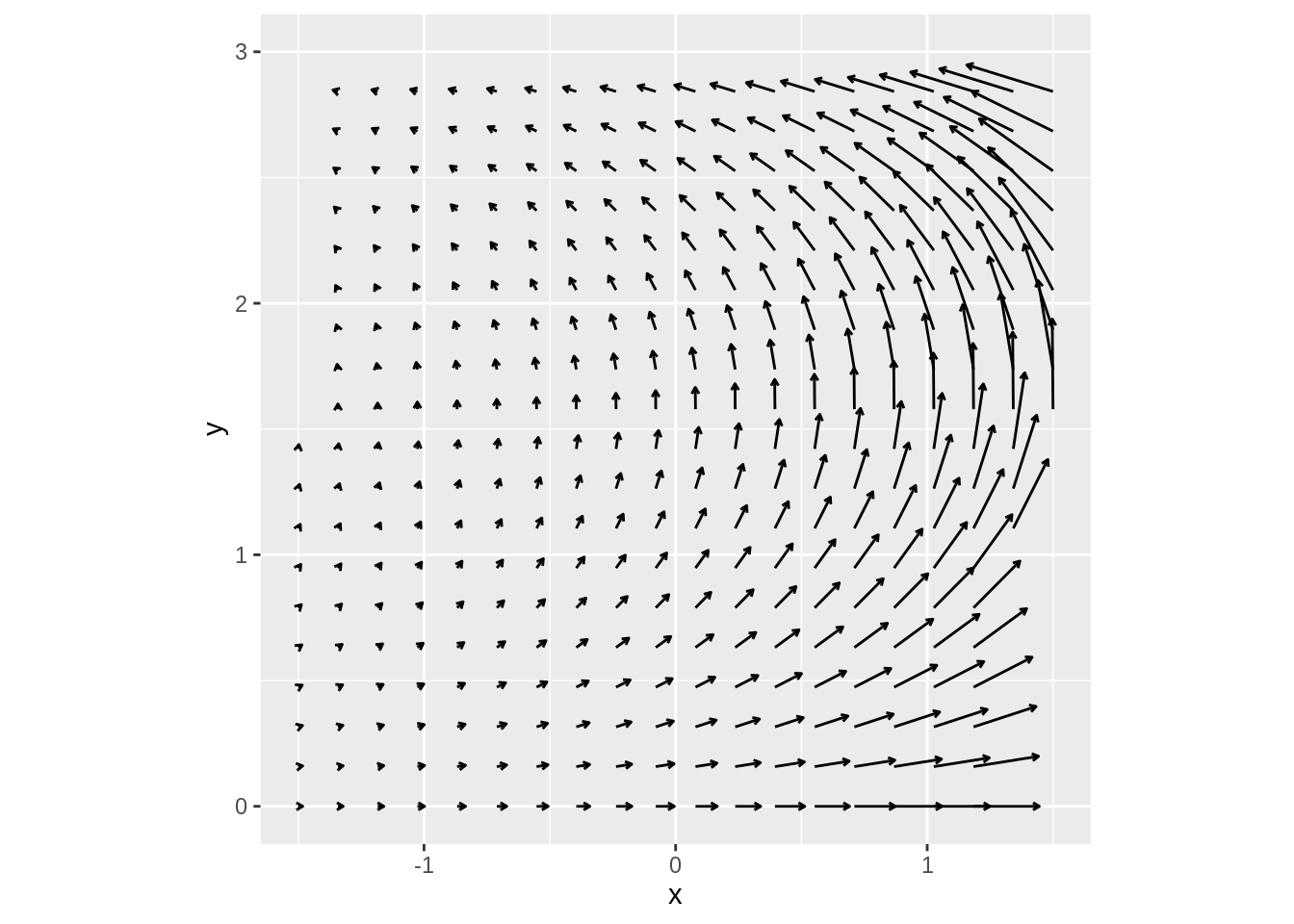 We can see clearly that this is not a conservative vector field: any integral over a circle centered at \((0,0)\) is going to be positive! This field seems to represent some sort of rotation around the origin.